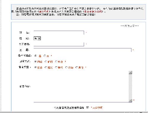 在搜索框中输入您想要查询的关键字,点击搜索按钮,即可出现搜索结果。点击您需要的内容进入相关页面查看。 2。网站表格下载功能 大兴卫生信息网提供相关表格下载功能。请您选择首页表格下载中相关表格名称,点击进入表格下载页面。在页面中点击附件中表格名称进行下载。(点击表格名称为直接打开表格,如果您想将表格保存在本地,请您右键点击表格名称,选择目标另存为即可) 3。如何进行网站留言 大兴卫生信息网提供网站留言功能,真诚地欢迎您为大 兴的发展提出建议,对于我们工作中的不足之处提出批评。 参与信访活动请您熟悉并遵守中华人民共和国国务院颁布的《信访条例》和北京市人大常委会通过的《北京市信访条例》。 请您点击首页网站留言模块,进入留言页面,如图: